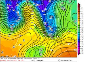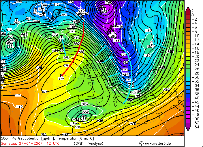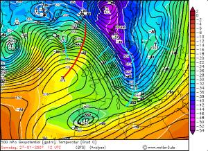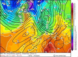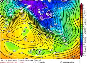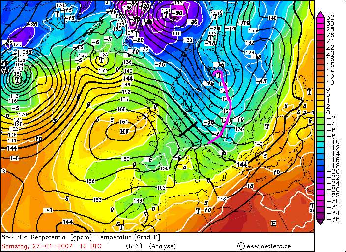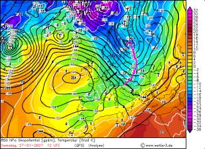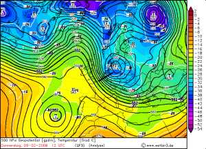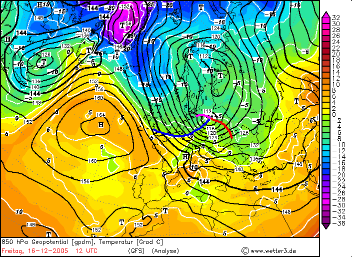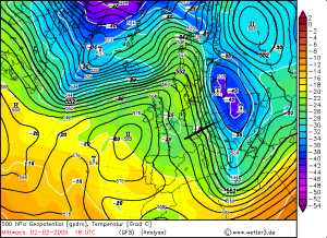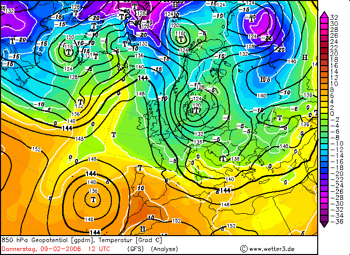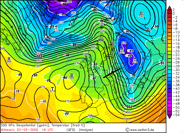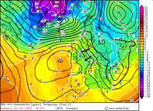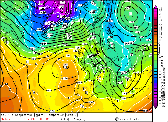 Der zweite Fall stammt vom 02. Februar 2005 und ist insofern grenzwertig, da die Warmluftadvektion zwar mit Nordföhndurchbruch abgeschlossen war, aber kein Kaltfrontdurchgang erfolgte. Die Analyse erfolgt mit Hilfe der 500hPa + 850hPa Geopotential/ Temperaturkarten von Wetter3.