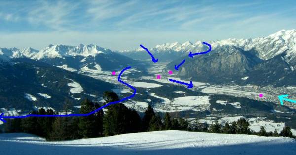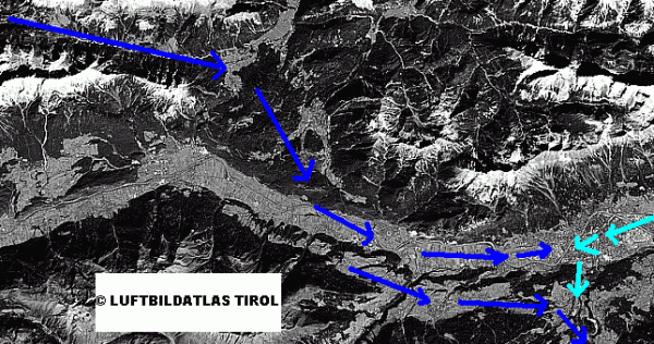 - Variante 2: Die Luft strömt vom Alpenvorland über den Seefelder Sattel ins Inntal und erreicht als Nordwestwind, manchmal auch durch das südliche Mittelgebirge als Südwestwind umgelenkt den Flughafen, im weiteren Verlauf als westsüdwestlicher Wind die Universität. Gegen eine Herkunft über den Scharnitzpaß spricht allerdings der dortige sehr enge Gebirgseinschnitt. Jedoch könnte die Luft über die Tallücke im Leutascher Achental hindurchkommen. Wäre jedoch nur bei reiner Nordkomponente eine plausible Variante, da der Wind sonst stark umgelenkt und gebremst würde.
