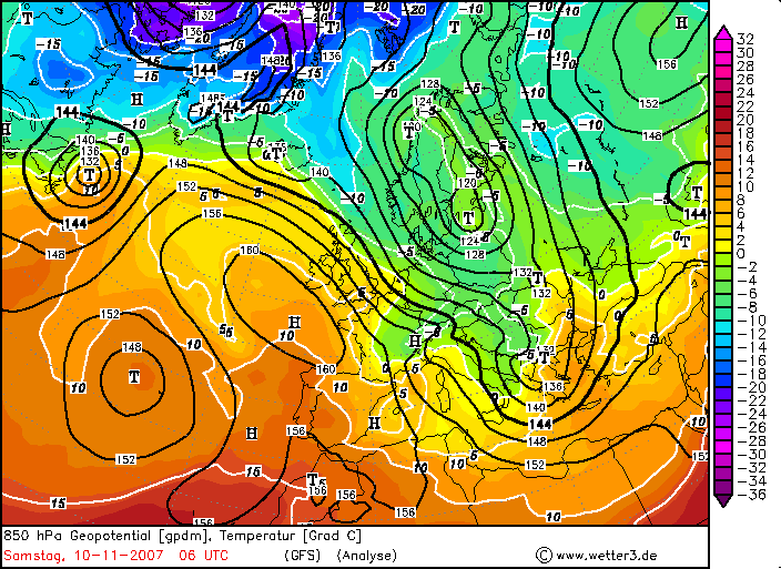 In 850hPa ist eine offene Welle (kein Okklusionsprozess) über Benelux in die Höhenströmung eingelagert und verlagert sich in dieser rasch weiter nach Südosten. Das Inntal befindet sich zu diesem Zeitpunkt noch unter Kaltlufteinfluss, ehe von Nordwesten wärmere Luft herankommt.