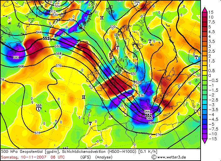 Die Schichtdickenadvektion zwischen 500hPa und 1000hPa ist ein Maß dafür, wie stark sich die zwischen beiden Höhen eingeschlossene Luftsäule ausdehnt oder staucht, also wie intensiv die Warmluft- oder Kaltluftadvektion mit der Höhe ist.