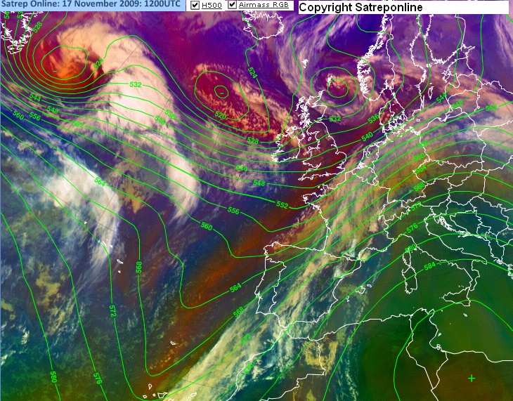 Die Großwetterlage vom 17. November 2009, 12 UTC, lässt sich am Besten mit dem Satreponline-Tool beschreiben, das Satelliteninformationen und EZMWF-Modellanalyse kombiniert: