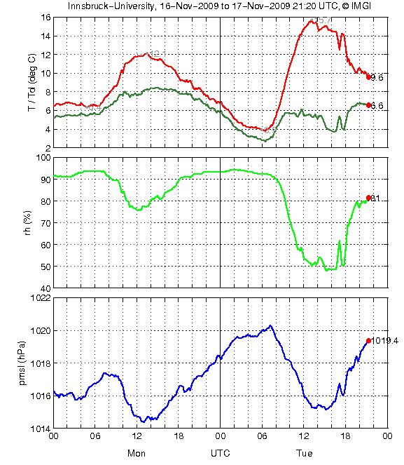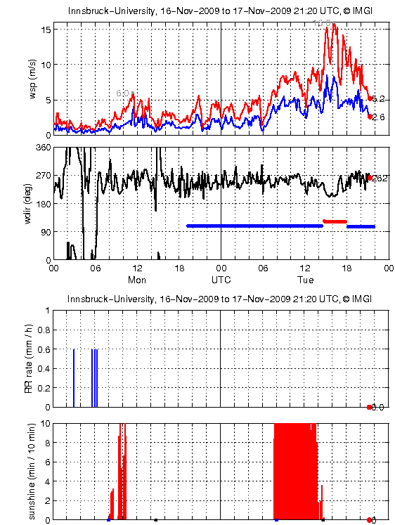 An der Uni ist der Zeitraum nach 18 UTC von Interesse, als der Wind leicht verstärkt talabwärts wehte. Das gewöhnliche, kaum nennenswerte Ausfließen sieht man am 16.11., vor 8 UTC, nach 18 UTC hingegen bis zu 2 m/s im Mittel und 5 m/s in Böen. Der Taupunkt lag zum Zeitpunkt des Sonnenuntergangs noch bei +8°C bei einer Lufttemperatur von 11,5°C. In der Wetterbesprechung wurde damit gerechnet, dass der vorföhnige Westwind die Bildung von Bodennebel verhindern würde. Zum Zeitpunkt des Bodennebels hatte es jedoch vorübergehend vom vorföhnigen Westwind entkoppelt, die Windgeschwindigkeit sank auf unter 2 m/s in Böen um 06 UTC, dazu korrespondierend das Temperaturminimum von +3,9°C. Tagsüber strahlte es nach Nebelauflösung stark ein, sodass ein Tagesgang von 11,8K zustandekam. Ab 8 UTC ging der Talauswind in einen stärkeren vorföhnigen Westwind über, bis um 15 UTC, zeitgleich zum Flughafen, der Föhn durchbruch. Während es an der Uni immerhin Böen bis 16 m/s gab, war der Wind am Flughafen deutlich schwächer und von der Windrichtung auch nicht eindeutig Föhn. Das Maximum lag hier mit +15,0°C etwas tiefer als an der Uni (+15,7°C). Am Flughafen hob der Föhn um 16 UTC wieder ab - an der Uni wehte er mit kurzer Unterbrechung um 17 UTC bis 18 UTC durch, und ging anschließend wieder in den vorföhnigen Westwind über.