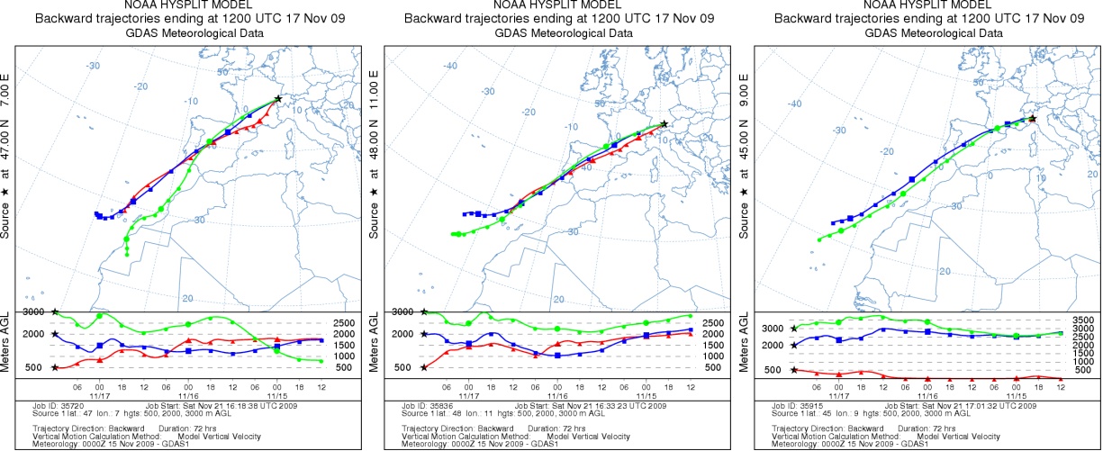 Zur Untermauerung der zwei Möglichkeiten bzw. zum Beleg dafür, dass die hohen 850-hPa-Temperaturen großteils advektionsbedingt sind, habe ich zwei Trajektorienplots mit dem Hysplitmodel berechnet - die Grundlage ist die Vertikalgeschwindigkeit im Modell, berechnet wurden die Trajektorien vom 17.11.2009, 12 UTC für 72h rückwärts, jeweils in den Höhen 500m, 2000m und 3000m über Grund, links für Basel, mittig für München:
