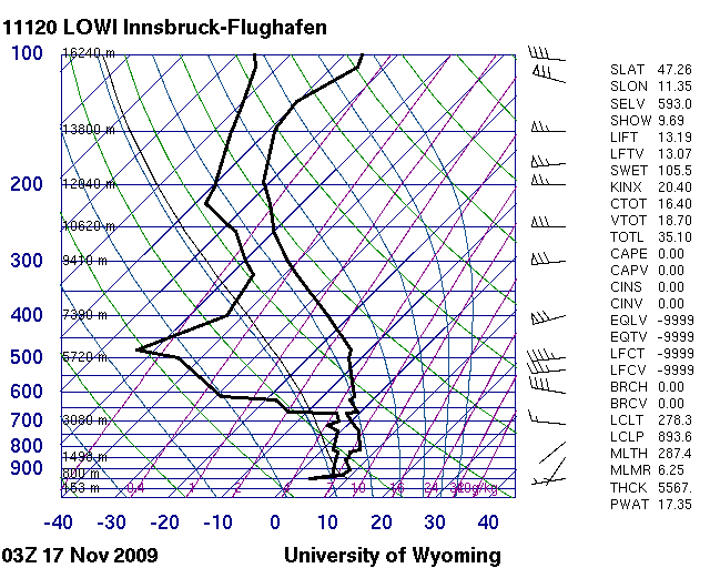 Der Radiosondenaufstieg von Innsbruck ist von der Interpretation her nicht trivial, da eine klassische gut durchmischte Föhnschicht fehlt. Es ist eine Bodeninversion zu erkennen, die durch Bodennebel gekennzeichnet ist, oberhalb ca. 1000m (Wipptalniveau) nimmt die Temperatur leicht ab, ehe ab 1800m wieder eine kleine Inversion folgt. Dies entspricht der Dicke der Föhnschicht.