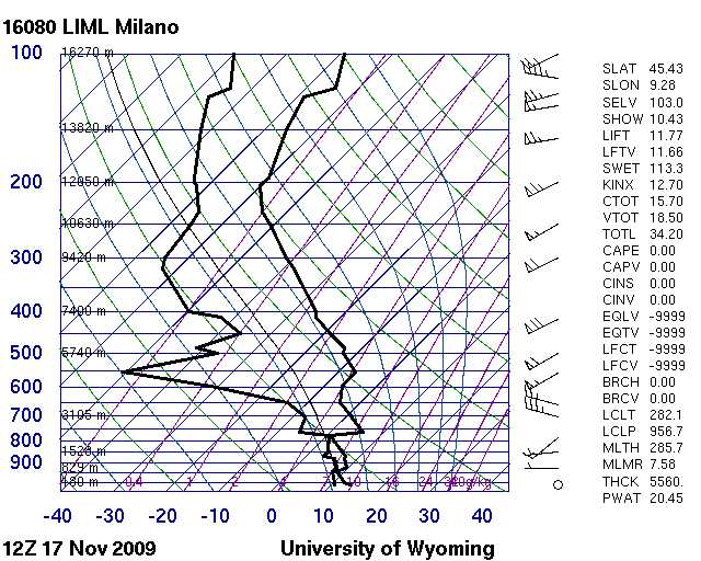 Im Mittagsaufstieg von Mailand herrscht am Boden Windstille, die Kaltluft kann sich lediglich in den untersten Hektometern leicht erwärmen, eine gut durchmischte Schicht befindet sich zwischen 1500m und 2300m, womöglich durch die französischen Seealpen erzeugt, während die EML zwischen 2300m und ca. 3500m von der großräumig advehierten EML herrührte. Oberhalb der markanten Absinkinversion der advehierten EML, die zugleich die Obergrenze des Hochnebels darstellt, weht starker West, später Südwestwind und die Luft ist sehr trocken, in 550 hPa wird ein Taupunkt von -50°C bei -7°C Lufttemperatur erreicht.