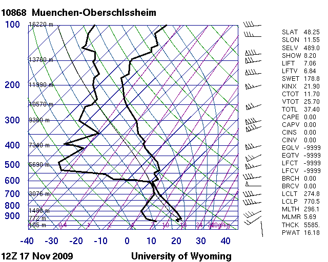 Die Föhnlage am 17.11.2009 offenbart Elemente klassischer seichter Föhnlagen, zeigt aber auch sommerliche Eigenschaften der Großwetterlage mit für die Jahreszeit ungewöhnlich hohen 850 hPa-Temperaturen, die nicht durch Absinken, sondern durch Advektion entstanden sind. Für die intensive Warmluftadvektion war ein bis zu den Kanarischen Inseln reichender Trog verantwortlich, der maritime Subtropikluft über Westeuropa bis Mitteleuropa schaufelte.Beim Überqueren der Pyrenäen erwärmte sich die Luftmasse weiter und gelangte mit 850 hPa- Temperaturen von 14-16°C in den Nordalpenraum. In der Poebene lagerte gleichzeitig unbewegliche Kaltluft, sodass ein alpenüberquerendes Druckgefälle resultierte. Durch den synoptischen Westwind blieb die Föhnströmung entkoppelt und damit seicht. Während das Wipptal und Innsbruck aufgrund der niedrigen Brennersenke potentiell kältere Luft aus Südtirol bezog, kam nördlich und westlich des Inntals ein weiteres sommerliches Element hinzu - eine entkoppelte, durchmischte Schicht. Der Föhn koppelte an diese Schicht und erzeugte dadurch eine bis Zugspitzniveau reichende Durchmischung mit entsprechenden Höchstwerten über 20°C in den alpenrandnahen Gebieten.