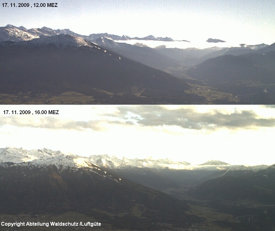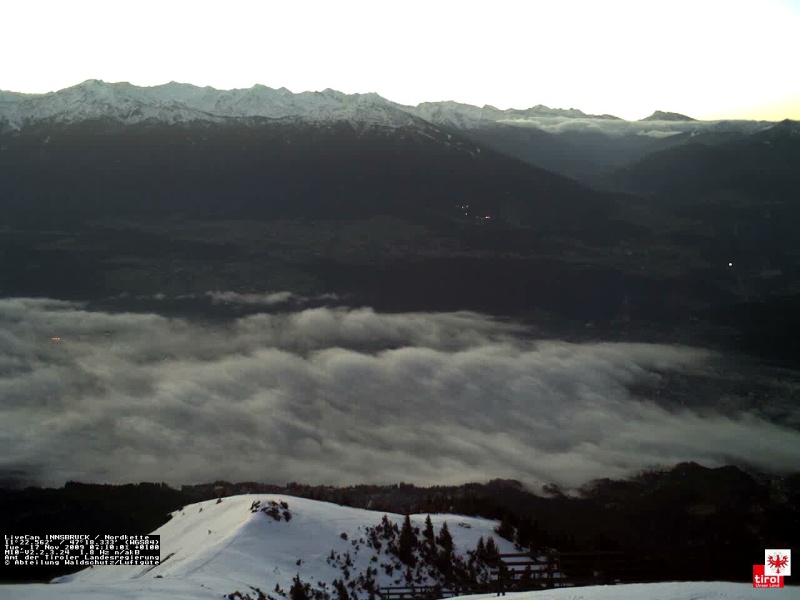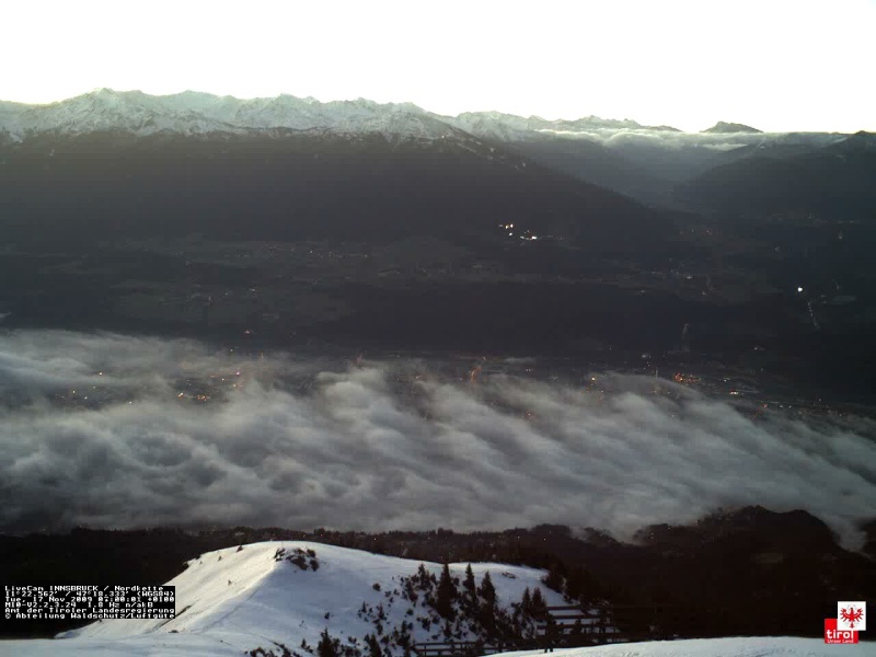 Zu Sonnenaufgang ist ganz Südtirol unter einer Hochnebeldecke verschwunden. Lediglich die höheren Gebirgsgruppen wie das Ortler-Massiv, die südlichen Zillertaler Alpen und die südlichen Ötztaler Alpen schauen aus dem Nebel heraus, auch einzelne Bergketten der nördlichen Sarntaler Alpen sind noch erkennbar. An der österreichisch-italienischen-Grenze hört die Hochnebelschicht wie abgeschnitten auf, das Wipptal ist wolkenlos, im Unterinntal halten sich von Innsbruck bis Kufstein flache Nebelfelder. Die Obergrenze der Hochnebelschicht lag in der Poebene um Mitternacht bei 2500m und sank bis zum Mittag auf 2300m ab. Dies stimmt auch mit den Webcambildern der Nordkette überein (s.u.), welche die Hochnebelobergrenze auf rund 2200m schätzen lässt.