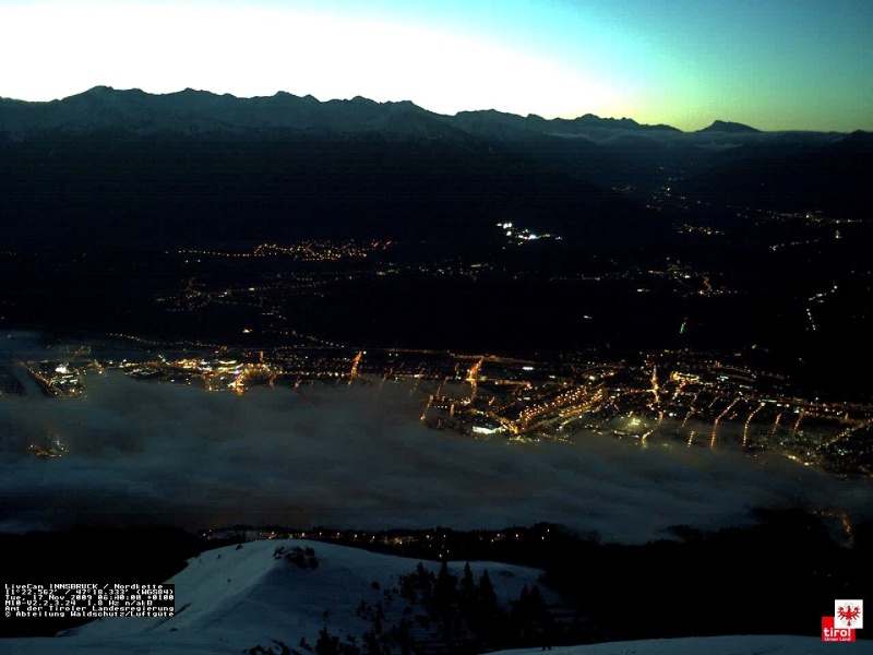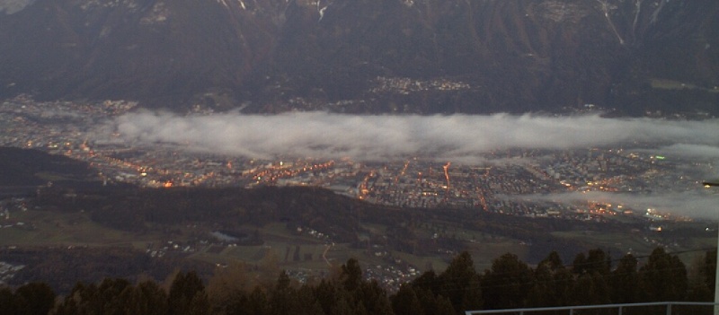 Zeitgleich vom Patscherkofelhaus aus reicht der Nebel von der Höttinger Au bis in den Osten Innsbrucks.