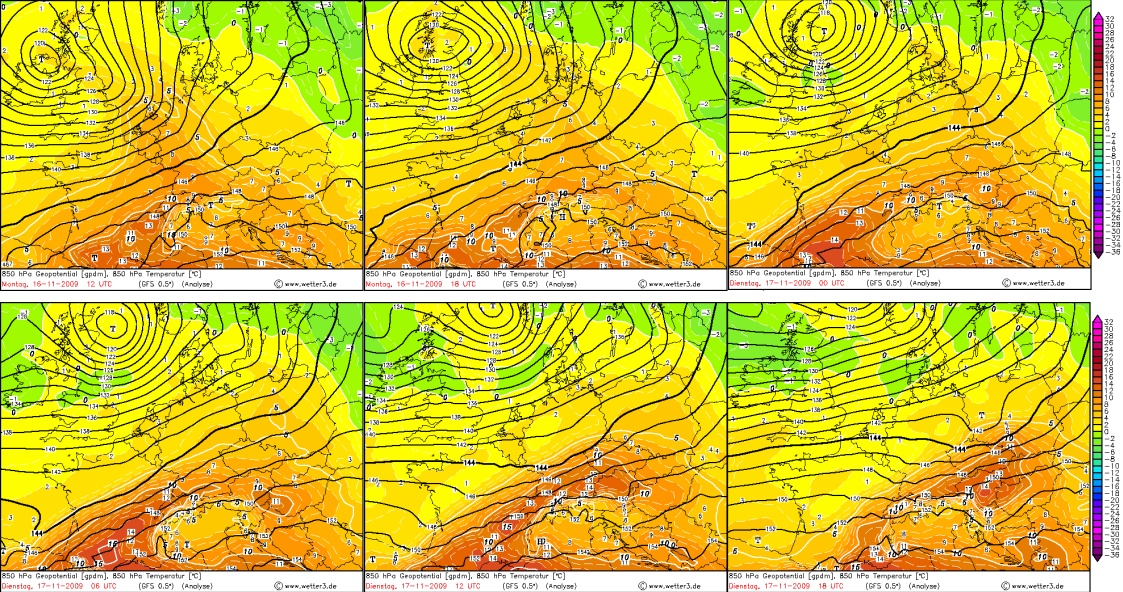Die 6h-Abfolge der 850 hPa-Geopotential + Temperaturverteilung zeigen die GFS-Analysekarten, beginnend mit Montag, 16.11.2009, 12 UTC, bis Dienstag, 17.11.2009, 18 UTC.