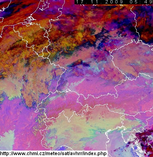 Der für die nachfolgende Analyse relevante Zeitraum erstreckt sich von Sonnenauf- bis untergang am 17.11.2009.Ehe die Frage geklärt wird, ob es sich um seichten oder hochreichenden Föhn im Wipptal handelt, soll der Antriebsmechanismus dieses Föhnfalls näher beleuchtet werden. In vielen deutschen Lehrbüchern wird als Voraussetzung für eine Föhnströmung Wolkenbildung und Niederschlag genannt. Dies ist falsch, da es Föhn auch ohne diese beiden Komponenten geben kann. Der 17.11. ist ein eindrucksvolles Beispiel für einen "antizyklonalen" Föhn. Die Wolkenbildung fungiert hier nicht als Wärmespender, sondern ermöglicht eine Verstärkung der horizontalen Druckdifferenz. Die nachfolgenden Satellitenbilder von NOAA und Sat24 zeigen eine beständige Hochnebelschicht auf der Alpensüdseite, die die Sonneneinstrahlung gänzlich verhindert.