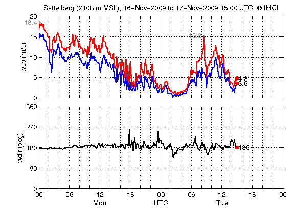 Mit der Passage des Randtiefs am Nachmittag bricht auch in Innsbruck vorübergehend der Föhn durch, als der Druckgradient maximal wird, ehe im weiteren Verlauf mit einsetzender Dunkelheit rasch wieder die Entkopplung durch Ausstrahlung die Oberhand gewinnt. Der Druckgradient bleibt bis zum Durchgang der Kaltfront in der zweiten Nachthälfte (nicht gezeigt) erhalten und verstärkt sich mit der Annäherung der Kaltfront nochmals, sodass auch am Sattelberg die Südströmung wieder stärker und in der Windrichtung beständiger wird (nicht gezeigt).