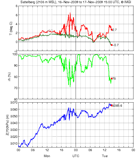 Charakteristisch für den Sattelberg sind bei Südföhn die üblicherweise sehr geringen Abweichungen der Windrichtungen von 180°, wie es zu Beginn der dargestellten Zeitperiode von 16.11., 00 UTC bis etwa 17 UTC, der Fall ist. In diesem Zeitraum ist der Temperaturverlauf noch recht konstant, nämlich stetig leicht steigend bis stagnierend. Nach 18 UTC wird der Wind deutlich schwächer, die Böigkeit nimmt ab, die Windrichtung schwankt stärker, die Temperatur und relative Feuchte unterliegen erheblichen Schwankungen. Daran ändert sich bis zum Ende des Zeitraums nichts mehr. Der Sattelberg befand am Oberrand der Föhnschicht, zu keinem Zeitpunkt war Ellbögen mit dem Sattelberg durchmischt. Die Föhnschicht war jedoch vertikal nicht stabil, sondern änderte ihre Obergrenze ständig, was die starken Schwankungen in allen Parametern erklären könnte.