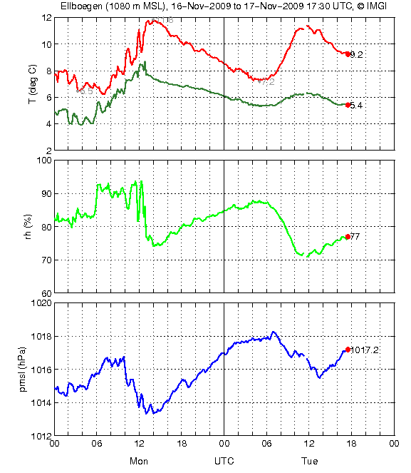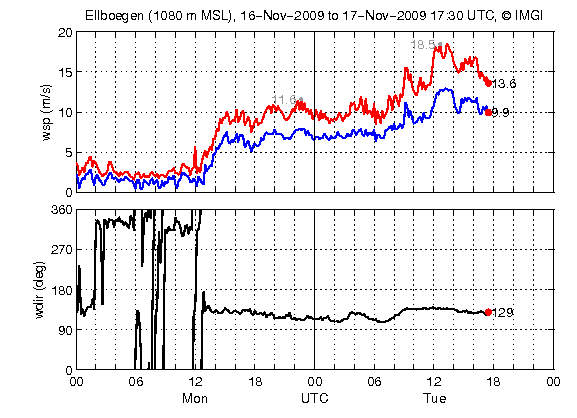 In Ellbögen ist die Situation eindeutiger: der Föhn brach bereits am 16.11., ca. 13 UTC, an der Station durch, damit einhergehend ein Feuchterückgang um 17 % und eine Temperaturzunahme um 3K. Der Wind drehte von Taleinwind auf Talauswind und wehte beständig, gegen Ende zunehmend mit 7-10 m/s im Mittel. Zum Zeitpunkt des Föhndurchbruchs war Ellbögen mit ca. 2000m durchmischt, um Mitternacht noch mit rund 1800m oder etwas weniger. Die Temperatur sank kurz nach Föhndurchbruch beständig ab, da sich die Druckdifferenz von Bozen nach Innsbruck sukzessive abschwächte und die Dicke der Föhnschicht damit abnahm. Der Zeitpunkt des Temperaturminimums in Ellbögen korreliert auch mit der geringsten Druckdifferenz Bozen - Innsbruck.