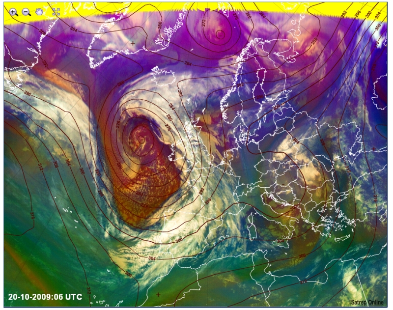 Das Satellitenbild in Falschfarben (RGB) vom 20. Oktober 2009, 06 UTC, überlappt mit dem 700 hPa Geopotential...