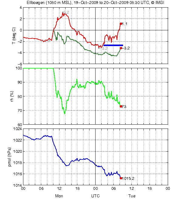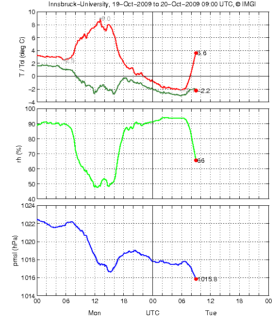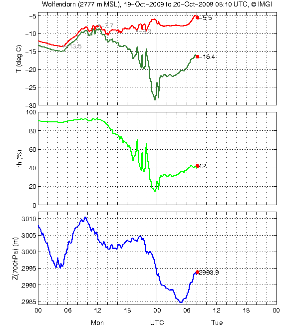 Die Innsbrucker Wind- und Temperaturdaten lassen den Föhn schon um 20 UTC vermuten, während in Ellbögen um diese Zeit ein Feuchteanstieg und Temperaturabfall verzeichnet. Erst um 3 UTC steigt die Temperatur um ca. 2K an, die relative Feuchte sinkt um 10 % und der Luftdruck sinkt ebenfalls um 1 hPa.