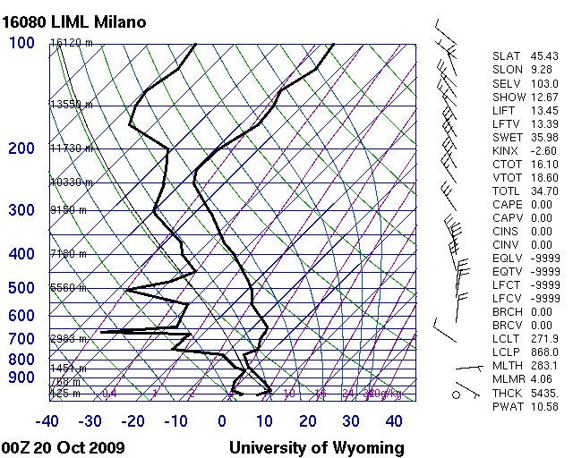 Der Innsbrucker Radiosondenaufstieg von 03 UTC zeigt eine schwache Strahlungsinversion, darüber einen nahezu isothermischen Verlauf mit der Höhe mit schwacher Südströmung und sehr trockener Luft. Vorausgesetzt, die Lufttemperatur in Mailand blieb unverändert, herrschte in 800 hPa immer noch eine geringfügig wärmere Luft als in Mailand.