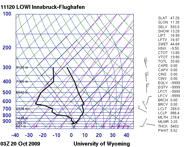 Am 19.10. in der Wetterbesprechung rätselten wir noch, ob es in der Nacht Hochnebel geben würde oder nicht. Der Taupunkt lag am Nachmittag nur knapp unter Null Grad, im Alpenvorland befand sich feuchtere Luft (Taupunkte 0-2°C) und es hatte mäßigen Taleinwind. Dazu sollte die Nacht unter Hochdruckeinfluss verlaufen und es befand sich noch Restfeuchte von den schwachen Niederschlägen am Wochenende im Tal. Die Wetterlage war also prädestiniert für Hochnebel, vorausgesetzt, das Einströmen vom Unterinntal her setzte sich auch am Abend fort.Für das Inntal gelten dann andere Gesetze als im Alpenvorland - das Talwindsystem ist hier federführend. Kühlt es nämlich im Tiroler Oberland bei wolkenlosem Himmel stark aus, dann fließt die kalte Luft von den Hängen und Seitentälern herab ins Inntal und gen Alpenvorland aus. Talauswind oder Talabwind bedeutet jedoch absinkende Luft und dadurch eine kontinuierliche Abtrocknung, also kein Hochnebel.