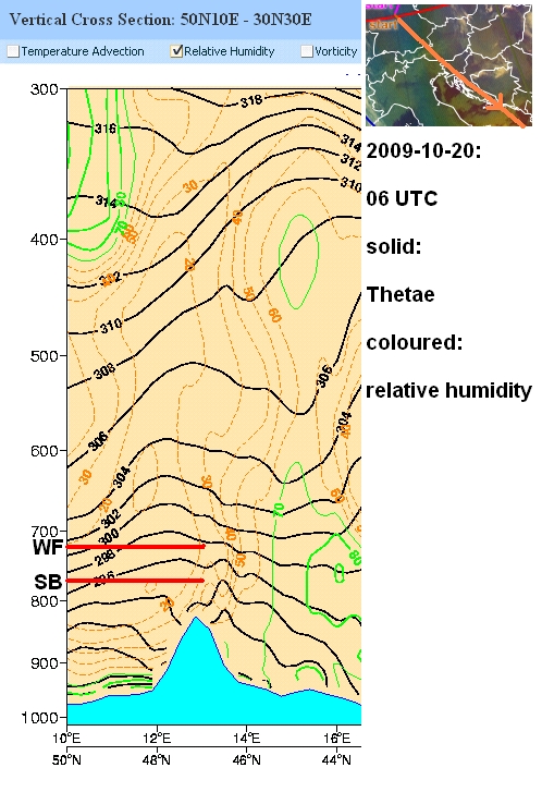 Im Vertikalprofil von 06 UTC , das entlang des Querschnitts von Süddeutschland bis Alpensüdseite reicht (siehe rechts oben), sind Thetae (ausgezogene Linien) und relative Feuchte (grün = hohe Feuchte, braun = niedrig) aufgetragen. Als Höheninformation habe ich Sattelberg und Wolfendorn angedeutet.