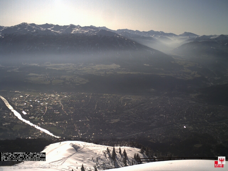 Das Webcambild von 8 UTC, als der Sattelberg bereits von der Föhnströmung entkoppelt war, zeigt eine ausgeprägte Dunstinversion in rund 1200-1400m Höhe, die in Richtung Brenner anzusteigen scheint, darüber regiert extrem trockene Absinkluft, darunter seichte Föhnluft.