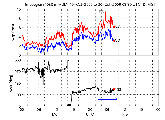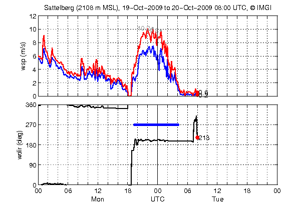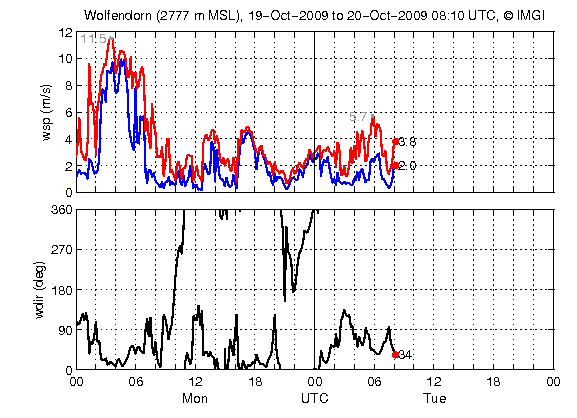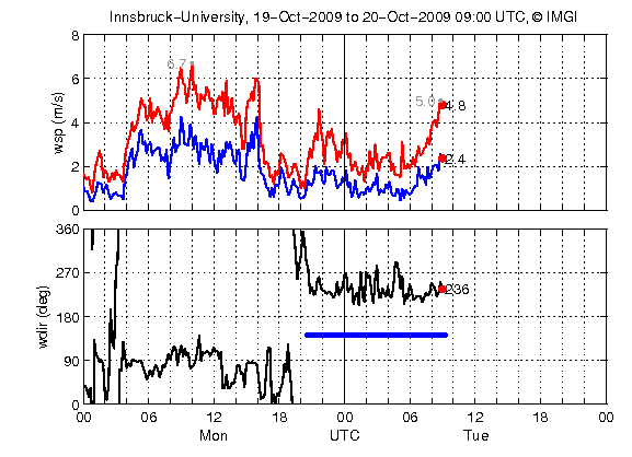 Im Windverlauf korreliert der schwache Temperaturabfall nach 20 UTC zu einem Windsprung von Einströmen auf Ausströmen (Talauswind = Westwind), der jedoch über dem klimatologischen Mittel (bei Hochdruckeinfluss) liegt, nämlich eine erhöhte Böigkeit aufweist, ab 06 UTC nimmt der Wind + Böigkeit stetig zu. Es handelt sich um den vorföhnigen Westwind, der dann weht, wenn der Föhn bereits oberhalb von Innsbruck durchgebrochen ist und durch seine wärmenden Eigenschaften den Luftdruck reduziert hat. Das resultierende Tiefdruckgebiet wird durch den verstärkten Talauswind, ausgeglichen.
