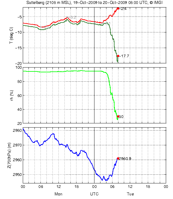 1. Zwischen 18 UTC und 03 UTC baute sich eine seichte Föhnströmung am Sattelberg auf, die teilweise ins Wipptal abstieg (Mischung aus normalen und föhnigen Ausfließen in Ellbögen) und in jedem Fall weit oberhalb Innsbruck über dem Inntal existierte. Dadurch sank der Luftdruck über Innsbruck (bzw. wurde an der Universität der Druckanstieg von der beginnenden Auskühlung gebremst) und der vorföhnige Westwind setzte ein.
