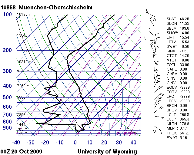 Mailand zeigt eine Absinkinversion in ca. 2,3km Höhe, in München bei 1,5km Höhe. Darüber findet sich sehr trockene Luft (vgl. Wolfendorn und Sattelberg). In 800 hPa, in etwa dem Niveau, aus dem die Föhnluft im Wipptal stammt, hat Mailand -3°C Lufttemperatur, München dagegen +1°C, potentiell ca. 14°C in Mailand und ca. 18°C in München. In höheren Schichten ist die Luft in Mailand potentiell wärmer (siehe Text-Daten der Soundings). Die für Südföhn notwendige potentiell kältere Luftmasse auf der Alpensüdseite war also vorhanden.