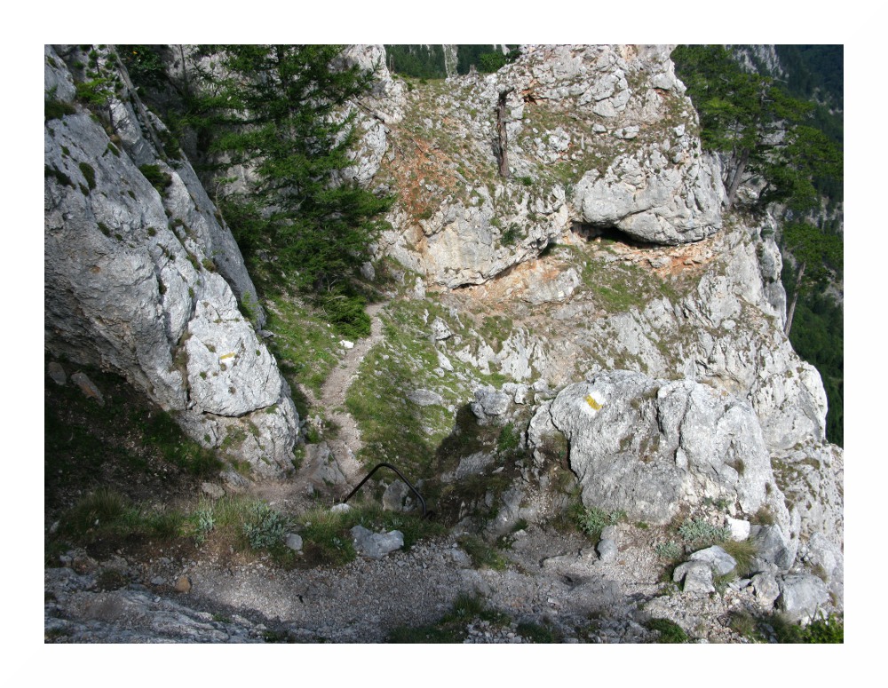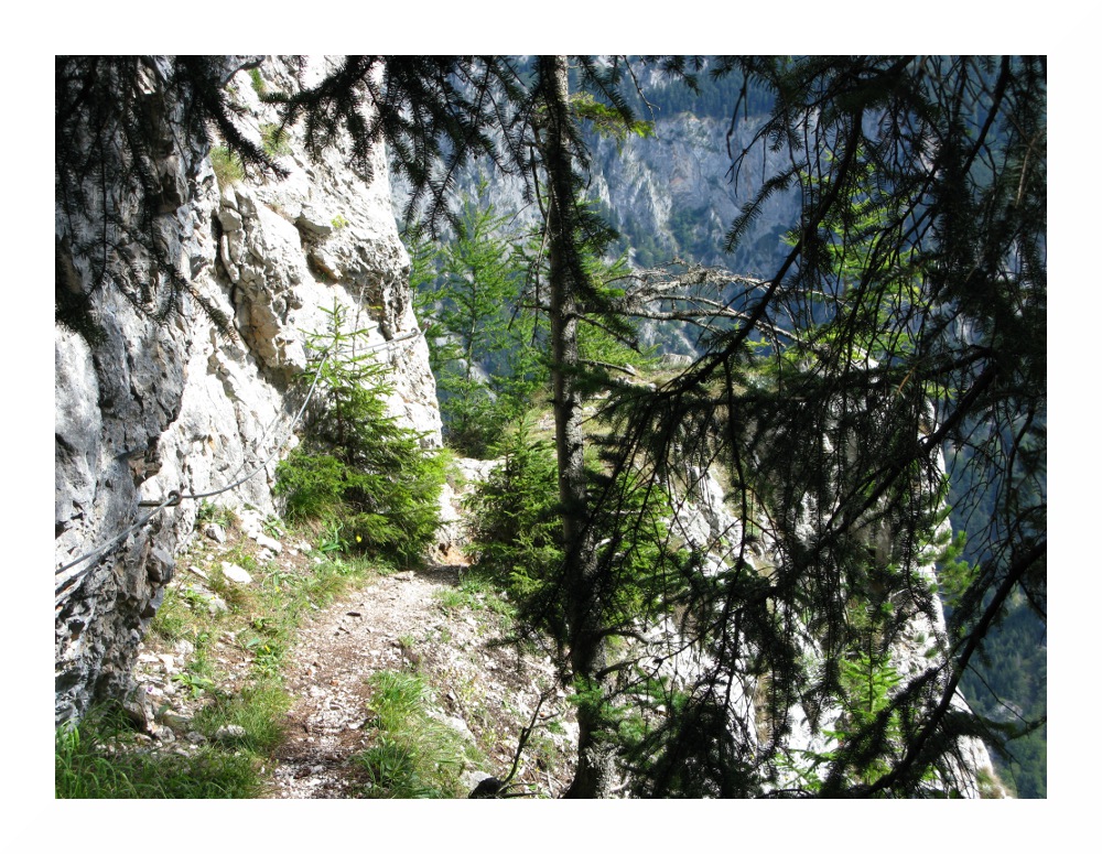 Der Steig wird im oberen Teil immer schmaler, klettern muss man aber nicht mehr. Der dichte Wald kaschiert dabei großteils die Ausgesetztheit, bis auf diese Stelle, wo Weg an Felsen entlang führt und eine Stelle vom Weg abgebrochen ist. Rechts geht es ziemlich steil hinab, sodass man die Versicherungen dankbar annimmt.