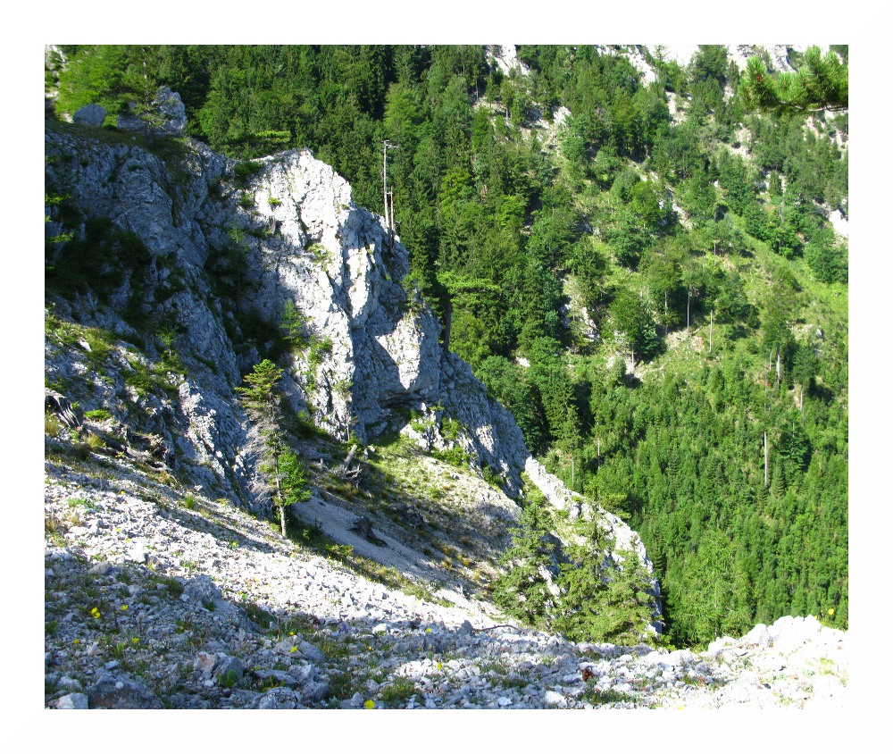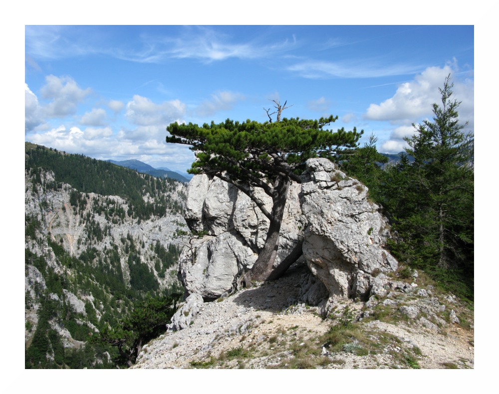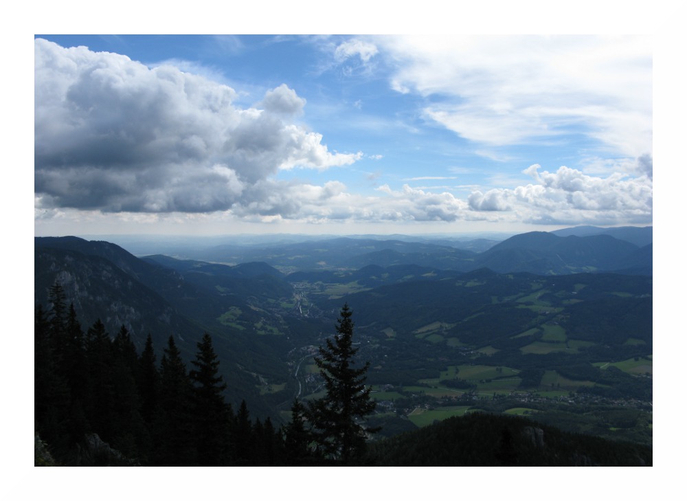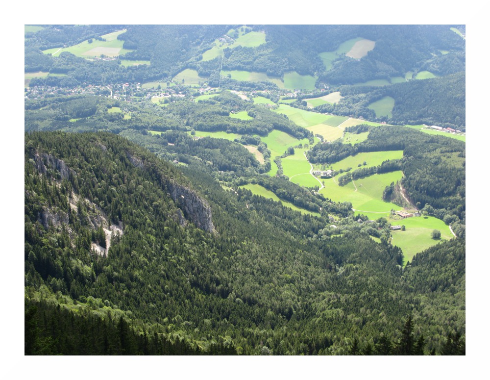 Ich wage mich bis zur Vorderkante des Felsgupfs. Tief im Tal schlängelt sich die Schwarza hindurch, rechts befindet sich das ausgedehnte Kuhschneebergplateau