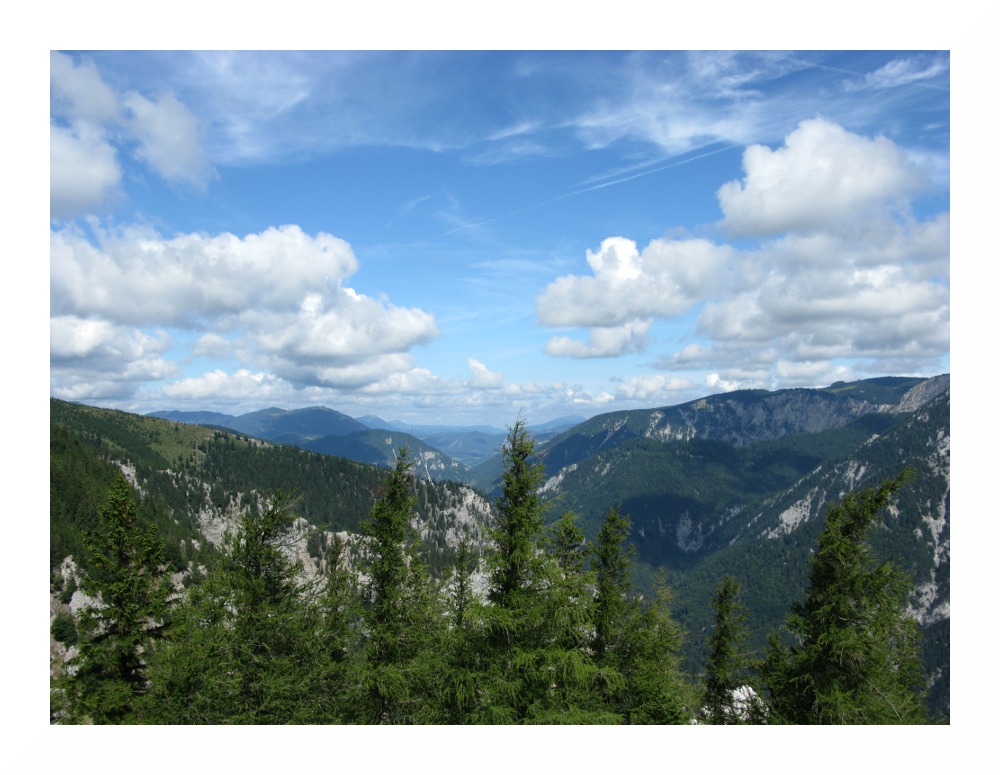 Kurz, bevor man die Weggabelung mit dem Gsolhirnsteig und das eigentliche Raxplateau erreicht, bietet sich nochmal ein umfassender Weitblick entlang des Höllentals nach Nordwesten
