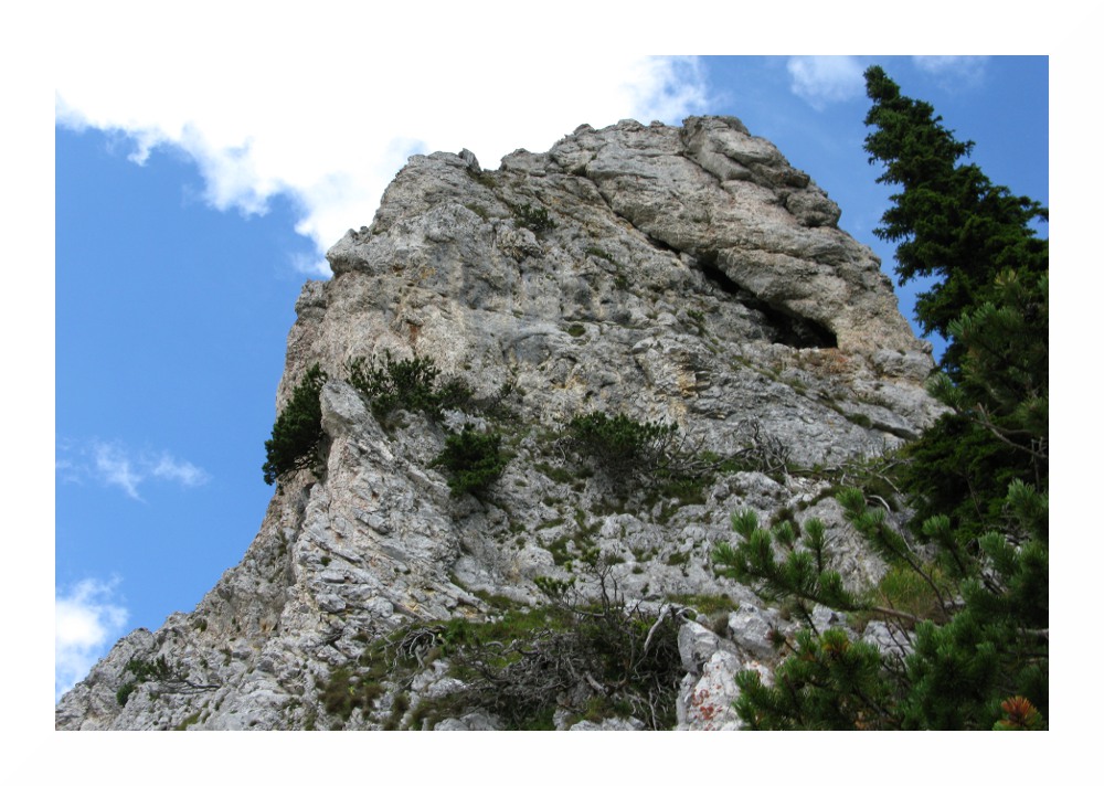 Rechts die kleine Grotte mit dem Schild der Namen der Pioniere der Rax, oberhalb der Grotte beginnt die Schlüsselstelle - der schräge Aufschwung (C/D)
