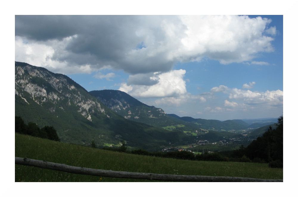 Links Mittagstein, dahinter Gahnsleiten, im Tal Payerbach-Reichenau mit dem Viadukt der Semmeringbahn. Dahinter erst befindet sich der Bahnhof. Ich bin viel zu früh im Tal, da ich die Busabfahrtszeiten falsch im Gedächtnis hätte. Aber ein Hatscher kommt bei der Nachmittagssonne nicht mehr in Frage. Ich fahre ab Hirschwang eine Stunde später mit dem Bus zurück.