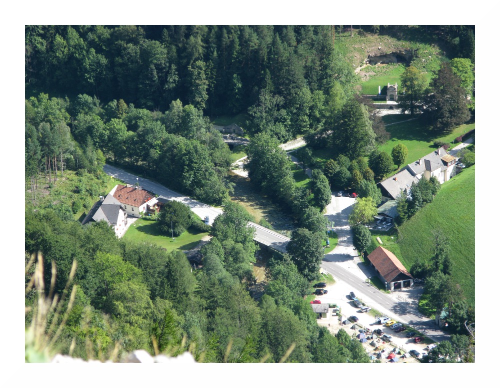Rückblick auf den Ausgangsort - links hinter den beiden Häusern kann man mit etwas Goodwill die gelben Wegweiser erkennen, rechts oben sieht man den namensgebenden Kaiserbrunnen, der seit dem Jahr 1869-1873 die Stadt Wien mit Hochquellenwasser versorgt. Unten der oft prall gefüllte Campingplatz.