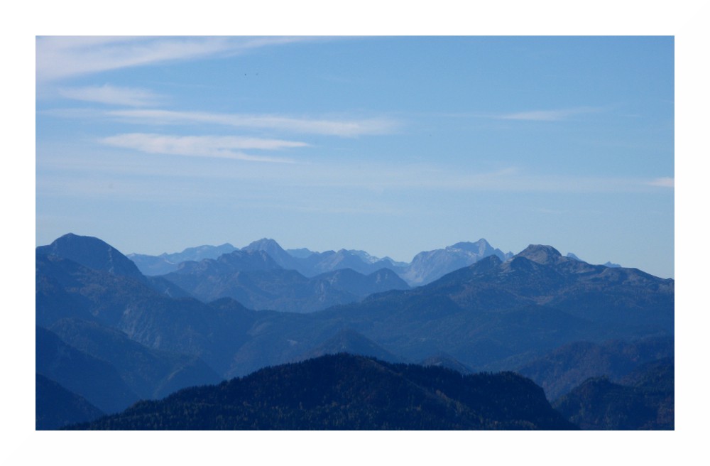 Rechts vom Dachstein schließen Mittagskogel (2041m, 77 km) und Natterriegel (2065m) sowie Hexenturm (2172m, 77 km) in den Haller Mauern an. Im Vordergrund die Zellerhüte, dahinter Hochkar (1808m), dahinter schauen zwei Spitzen heraus, die Linke ist der Kesselkargrat (1984m, 78 km), weiter rechts wuchtiger Scheiblingstein (2197m, 81 km) und Großer Pyhrgas (2244m, 83 km). Am rechten Bildrand unverkennbar die flache Pyramide des Warschenecks (2388m, 95 km) im Toten Gebirge.