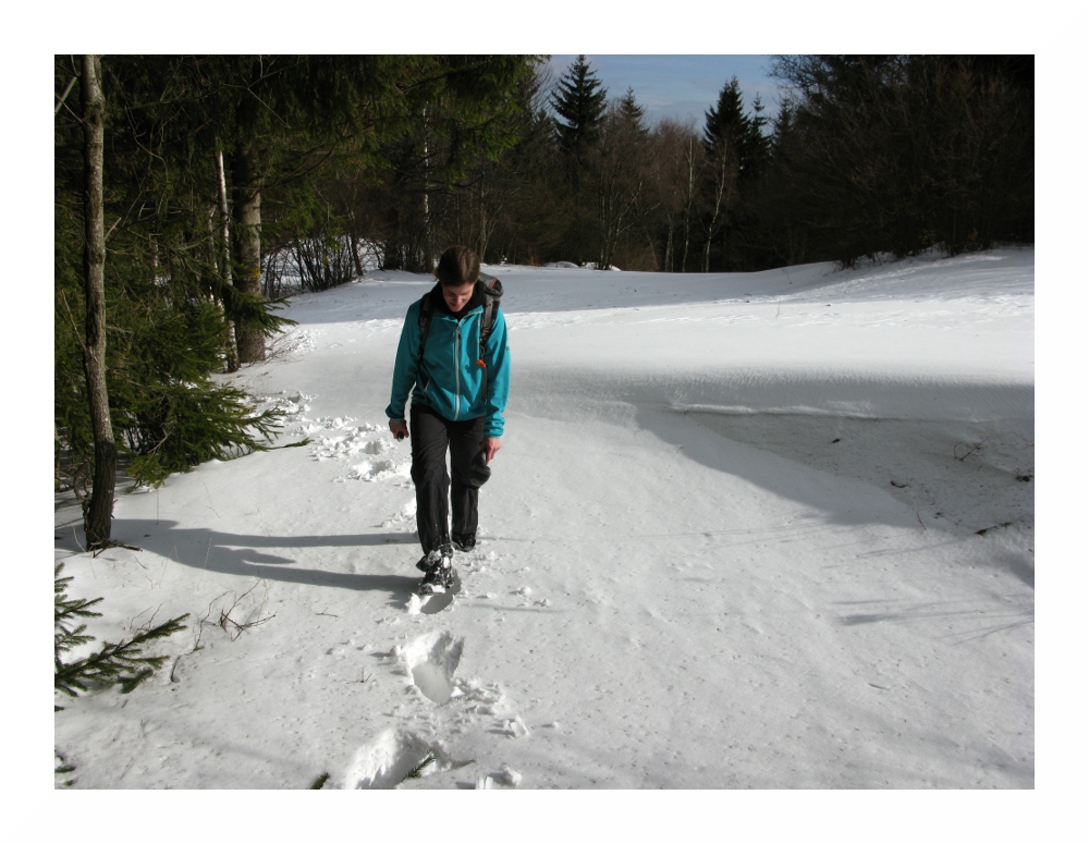Der Retourweg begann mit weiterer Tiefschneestapferei, da bis in tiefe Lagen noch viel Schnee lag. Er war jedoch relativ gut markiert (blau) und nicht zu verfehlen.