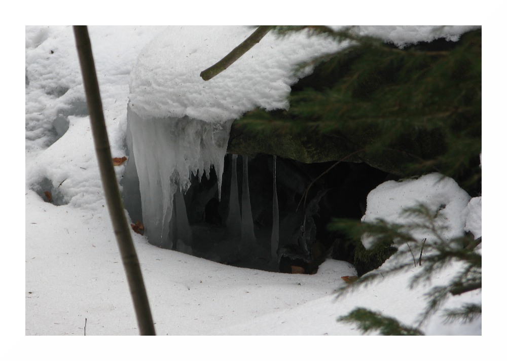 Die bizarren Eisskulpturen setzten sich fast bis ins Tal fort. Selbst auf rund 270 m war der Wasserfall noch großteils gefroren, auch wenn man unter der kompakten Eisdecke das Wasser rauschen hörte.