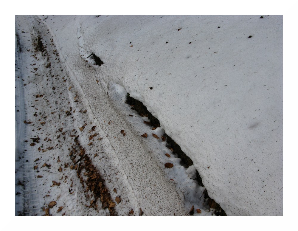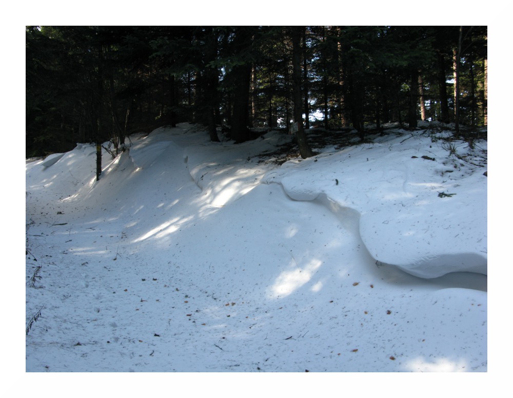 Bild 6: Mächtige Schneeverwehungen am Weg zeigen von den hohen Windgeschwindigkeiten, für die der Jauerling berüchtigt ist (hier: auf ca. 700 m)