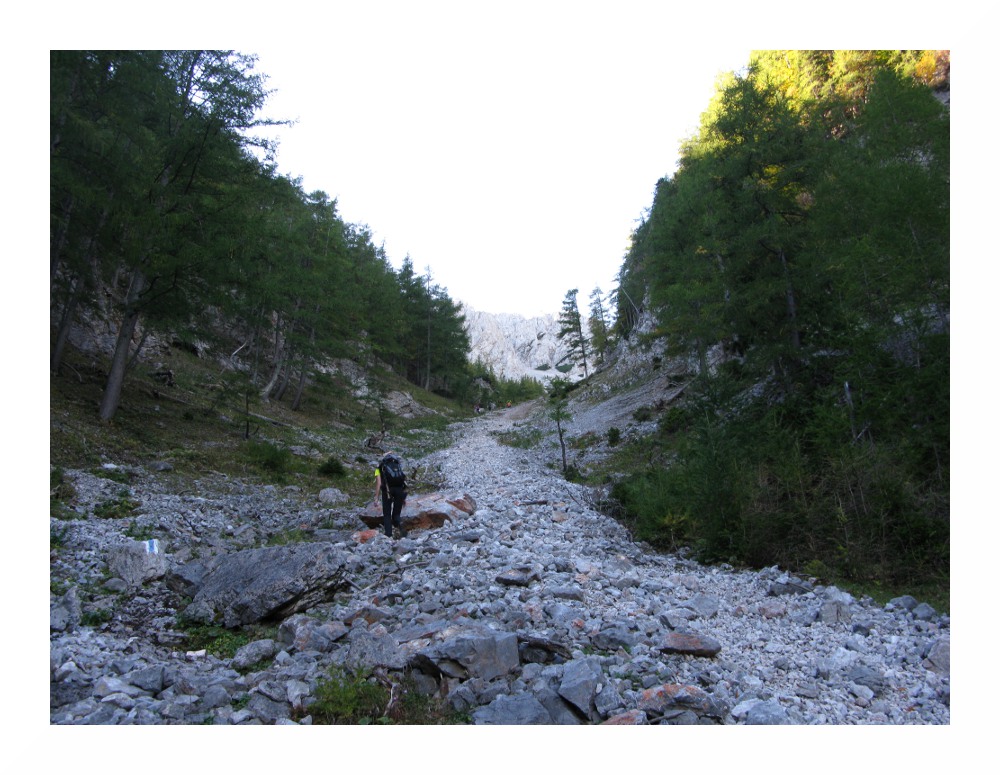 Der Untere Schneidergraben ist wirklich mühsam, teils geht man auf den Schotterreisen aufwärts - frei nach dem Motto zwei Schritte vor, einer zurück -,