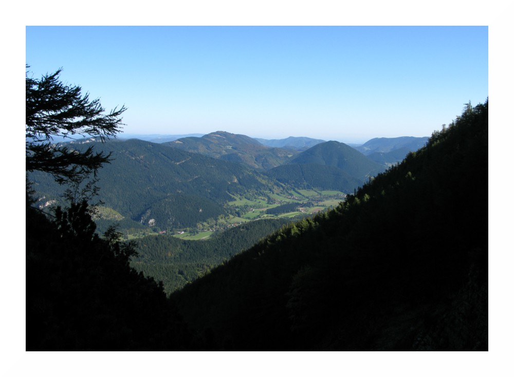 Dürre Wand, Haltberg, Himberg und Niederer Hengst umrahmen das Becken, im Hintergrund die Hohe Wand (wirkt aus gut 1700 m eher mickrig),