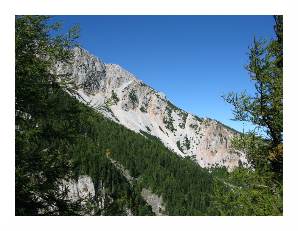 Bild 7: Blick auf die Nadelwaldzone unterhalb der Rieswände sowie die Breite Ries und auf ein Teilstück des Nandlgrats