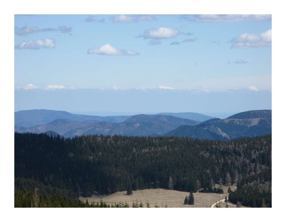 Rechts unten die Bodenwiese, im Hintergrund mittig Hohe und Vordere Mandling (vgl. Tour vom 24.3.) in 22 km Entfernung. Links der Hohen Mandling der Katharinenschlag (1222m), Teil der Dürren Wand. Zwischen Dürrer Wand und Mandling schaut man zum Wienerwald in unmittelbarem Umkreis von Wien in 60-70 km Entfernung.