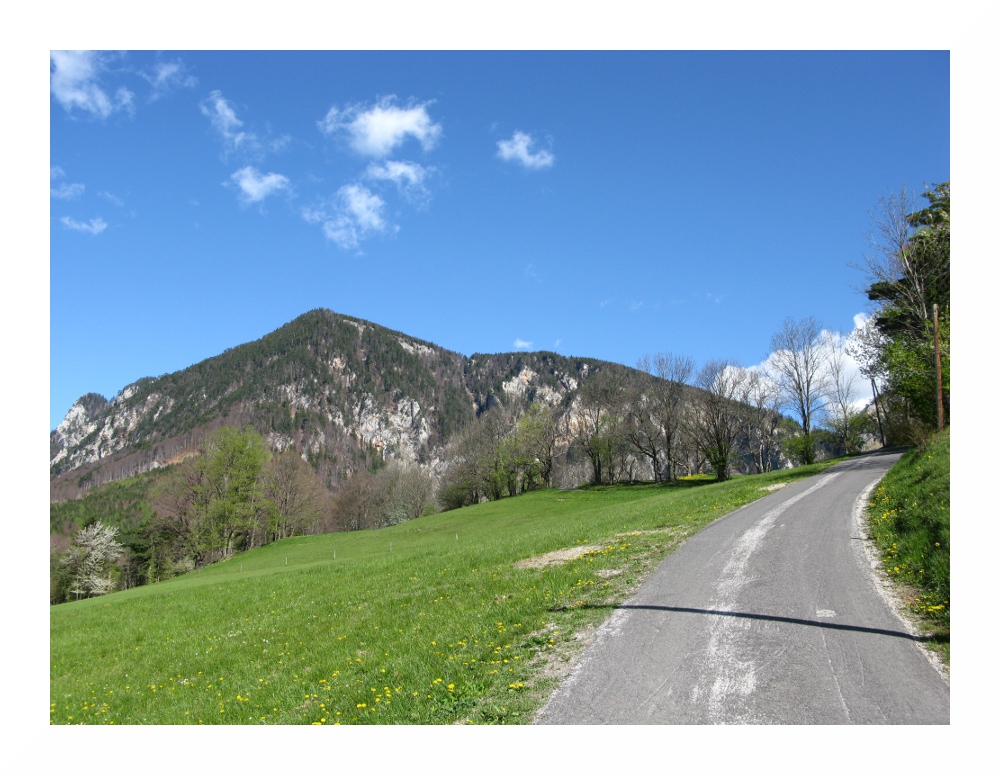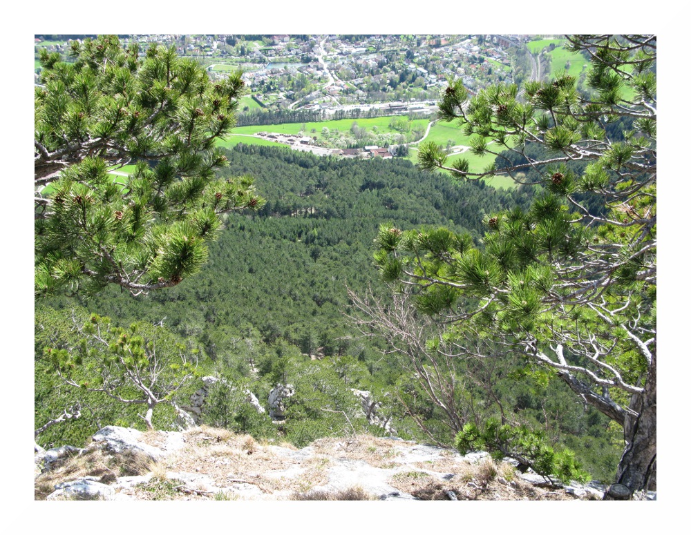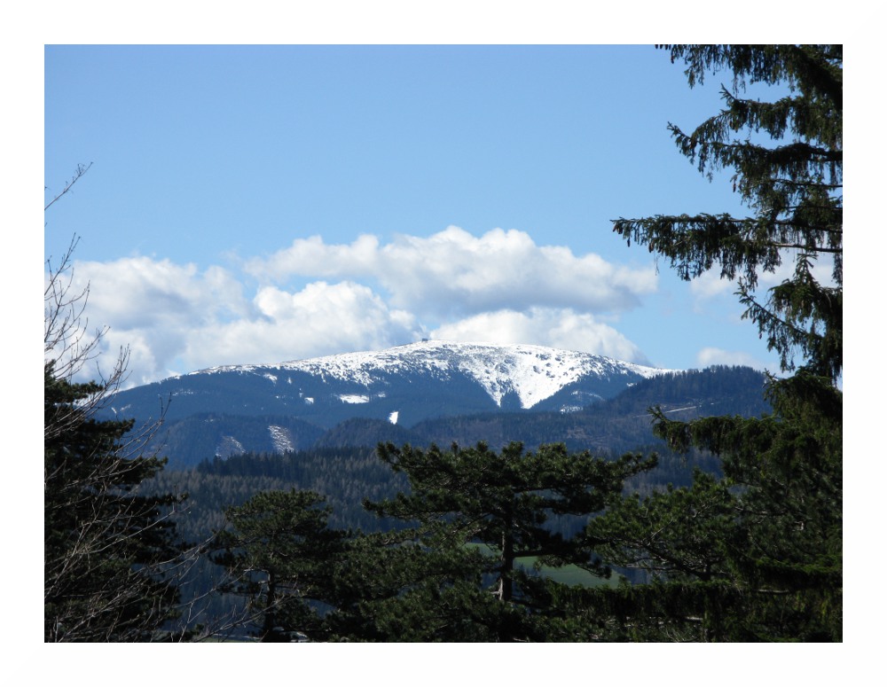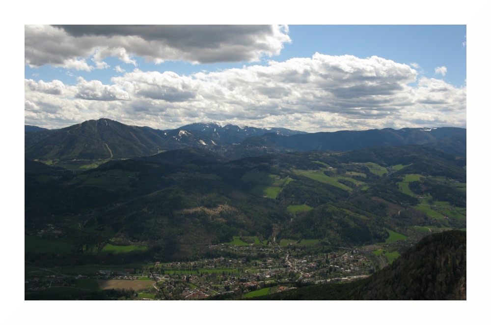 Im Tal Payerbach, im Hintergrund links Sonnwendstein (1523m) mit ORF-Sendeanlage, rechts daneben mit wenigen Schneeresten Hirschenkogel (1340m), dahinter thront das Stuhleck und in der Senke der Semmeringpass (984m), weiter rechts mit Pinkenkogel (1292m), Ochnerhöhe (1403m) und Kampalpe (1535m). Um die Hügel im Vordergrund herum verläuft die Semmeringbahn. Ich genieße den Ausblick jedes Mal, insbesondere in die zerklüfteten Adlitzgräben.