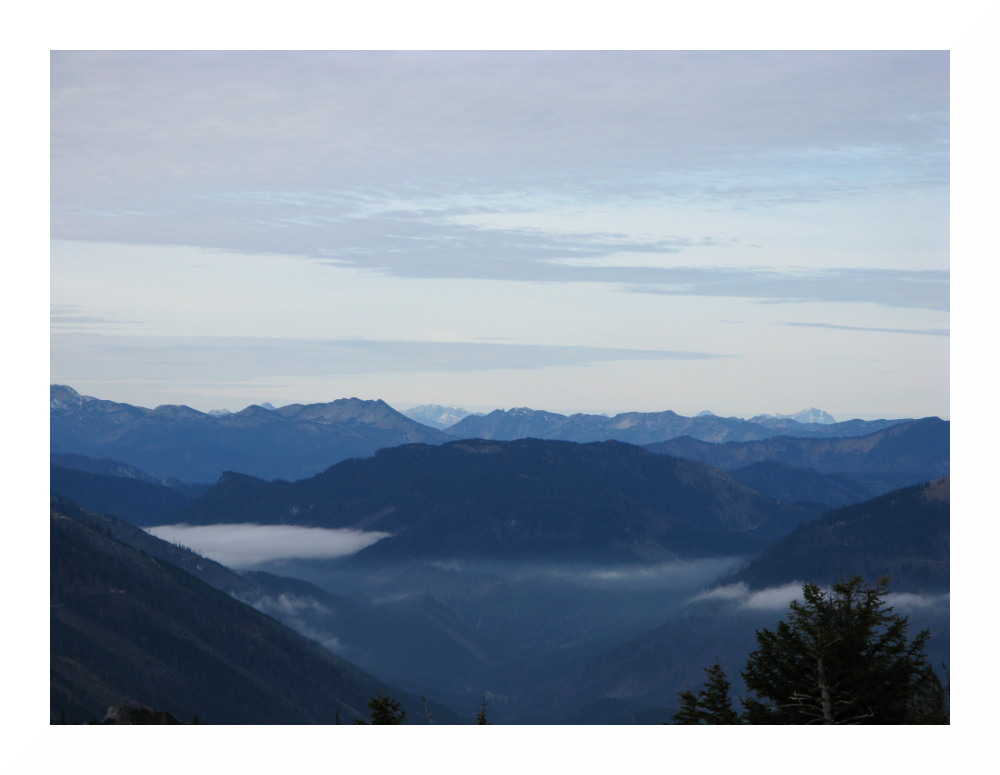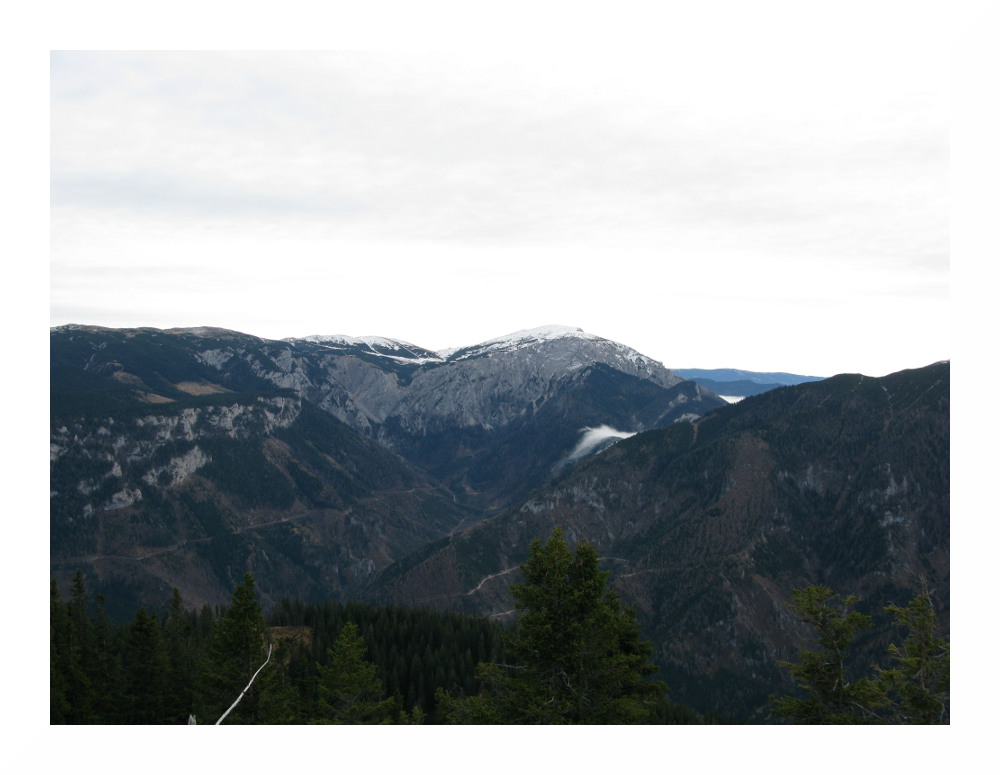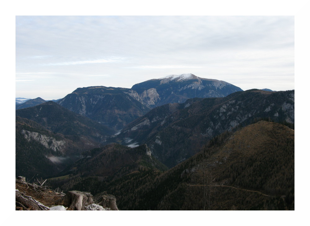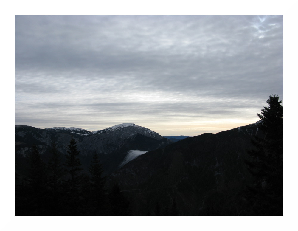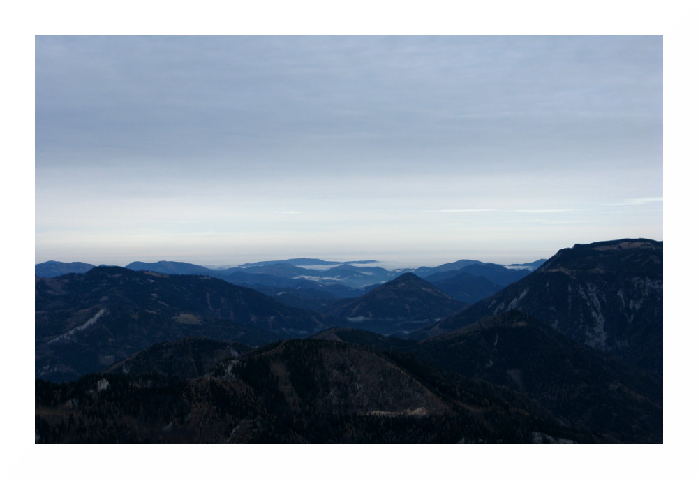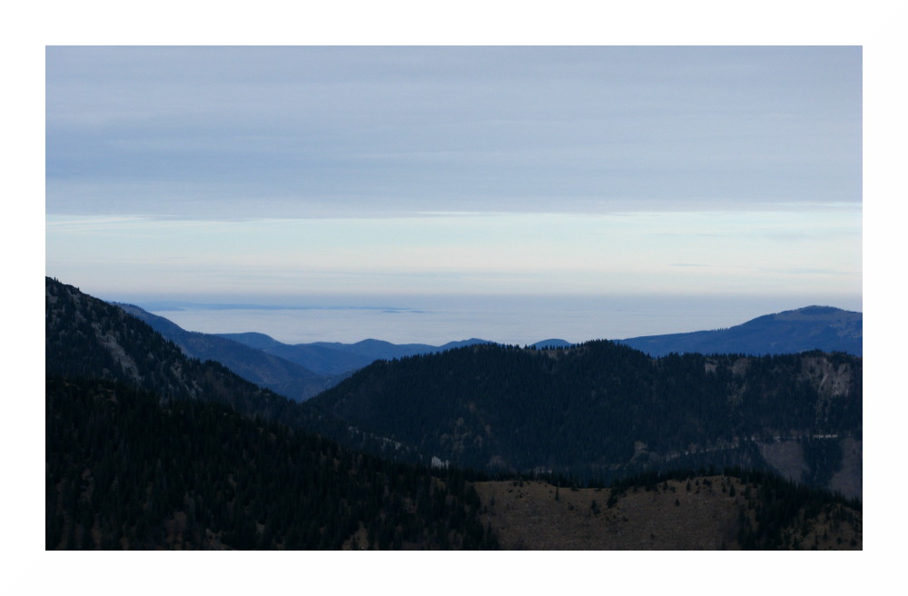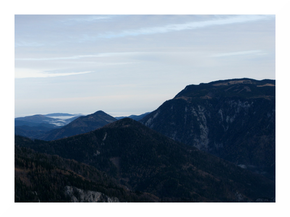 Bild 10: Links Handlesberg (1370m); Hoher Lindkogel und Sooßer Lindkogel (713m) schälen sich am Horizont aus dem Nebel heraus.