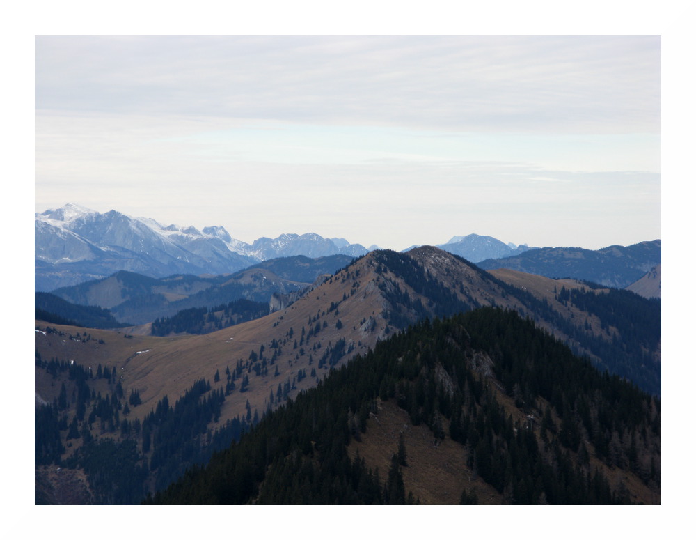 Im Vordergrund Hohes Waxenegg (1647m), links dahinter Hochschwab und Ebenstein, dann Brandstein (2003m,52 km),
