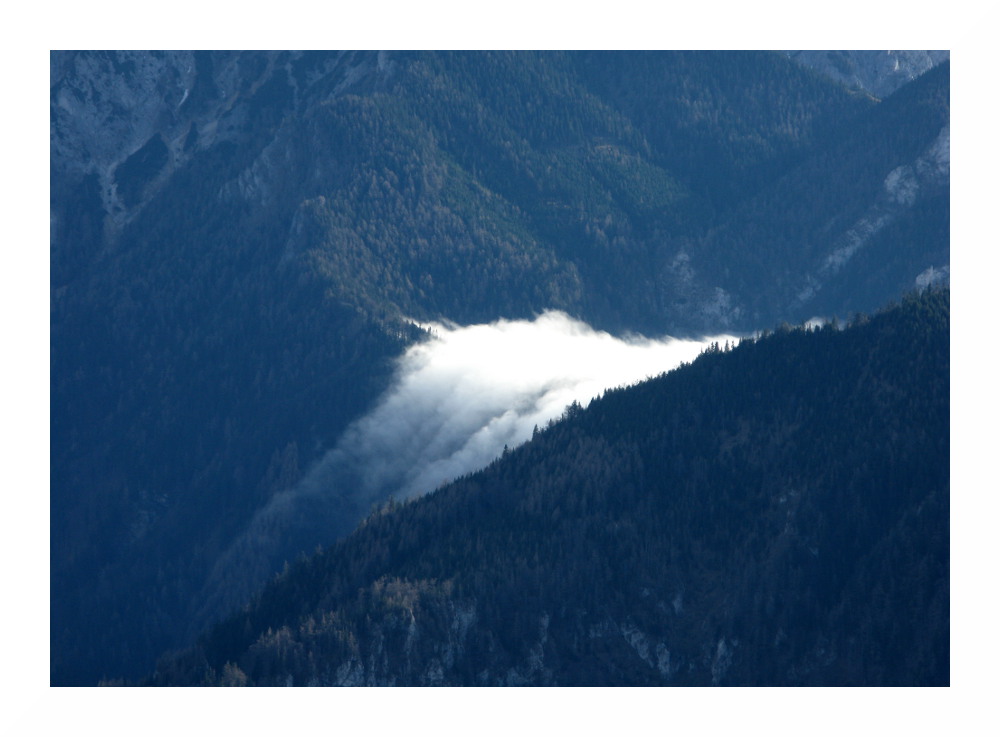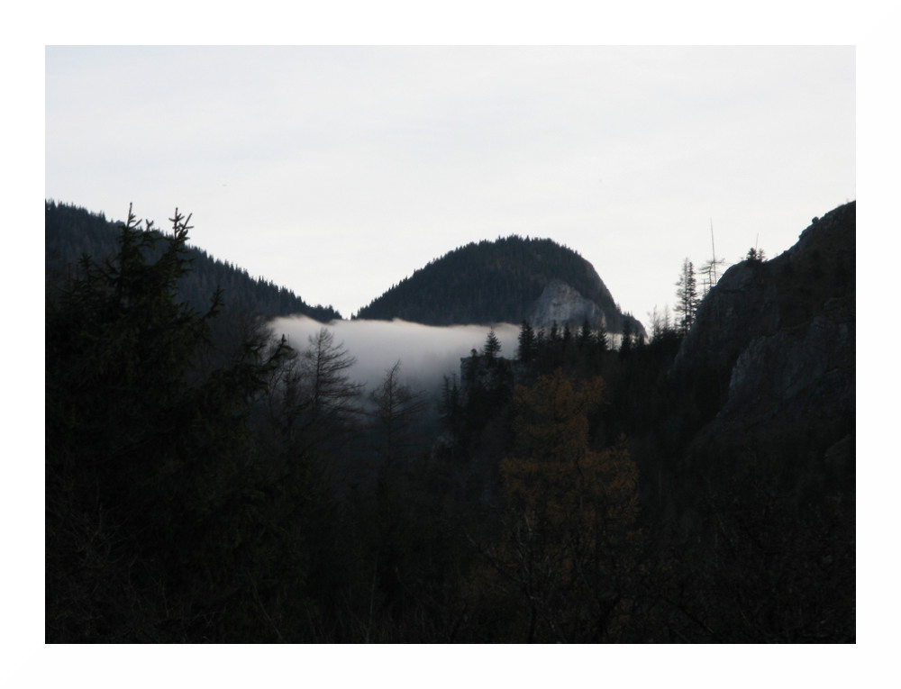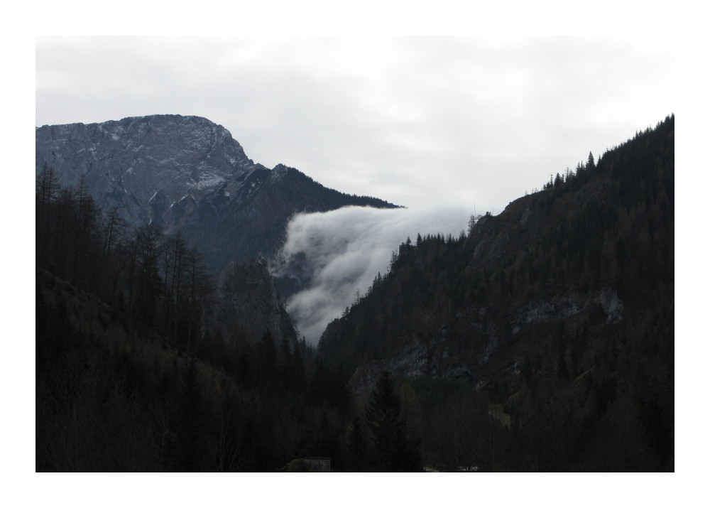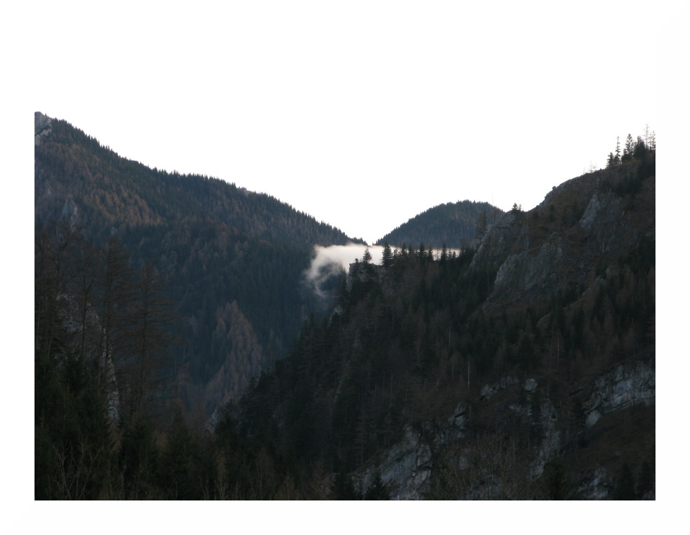 schlagartig wird es um einige Grad kühler und mit dem schwachen Talauswind beißender.Bild 34: Der Nebel züngelt noch, aber ist erheblich tiefer und weniger als vorher.