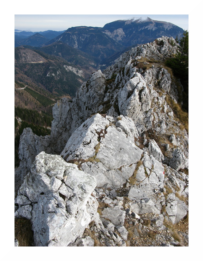 Bild 33: Blick in den zerklüfteten Nordteil der Rax, darüber Scheibwaldhöhe und Dreimarkstein