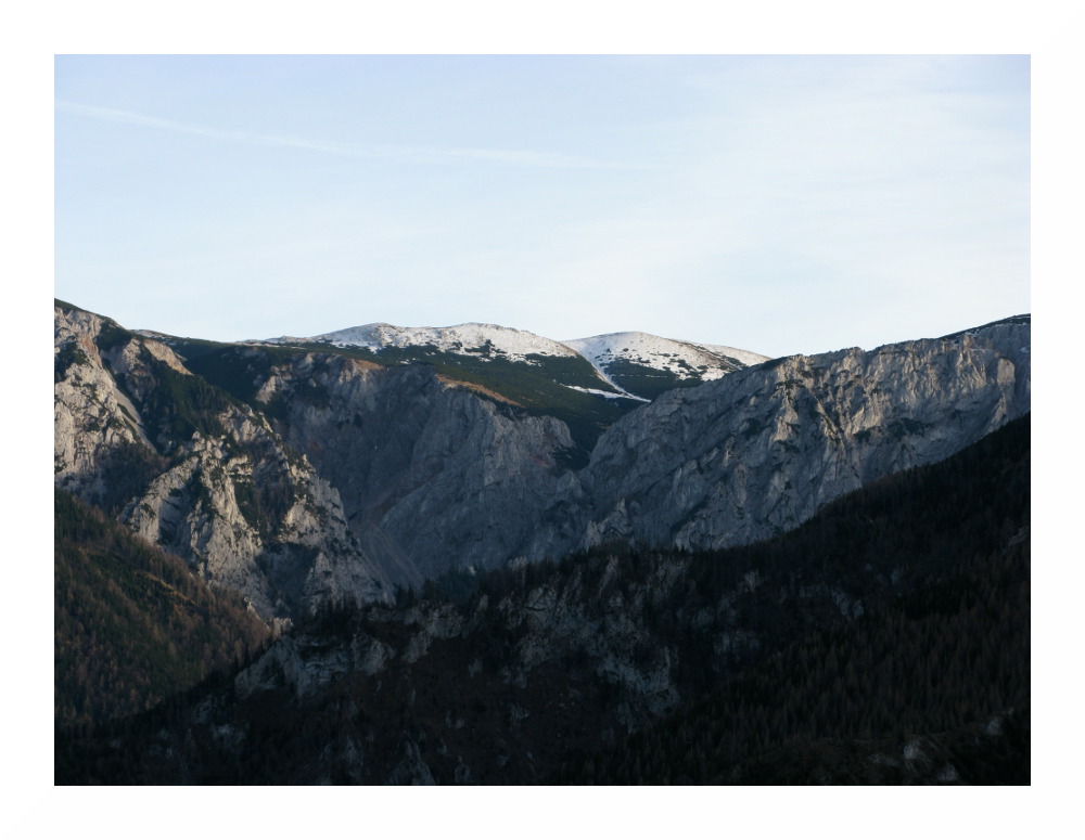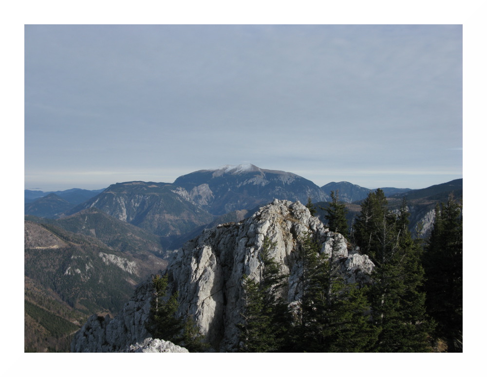 Bild 4: Kuhschneeberg, Schneeberg und Krummbachstein (über die nördlichsten Ausläufer der Rax herausschauend)