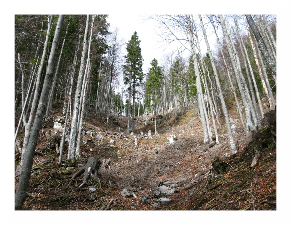 Bild 3: Nachdem wir den unangenehm lehmigen Teil hinter uns gelassen haben, zieht der Weg durch den von Orkan KYRILL in Mitleidenschaft gezogenen Hang hinauf: