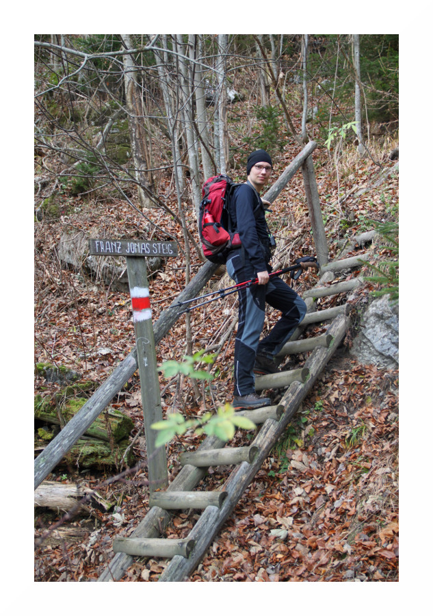 Kurz darauf biegen wir nach Norden in den steilen Graben ab, durch den der Franz-Jonas-Steig in engen, steilen Serpentinen rasch Höhenmeter gewinnend hinaufführt.