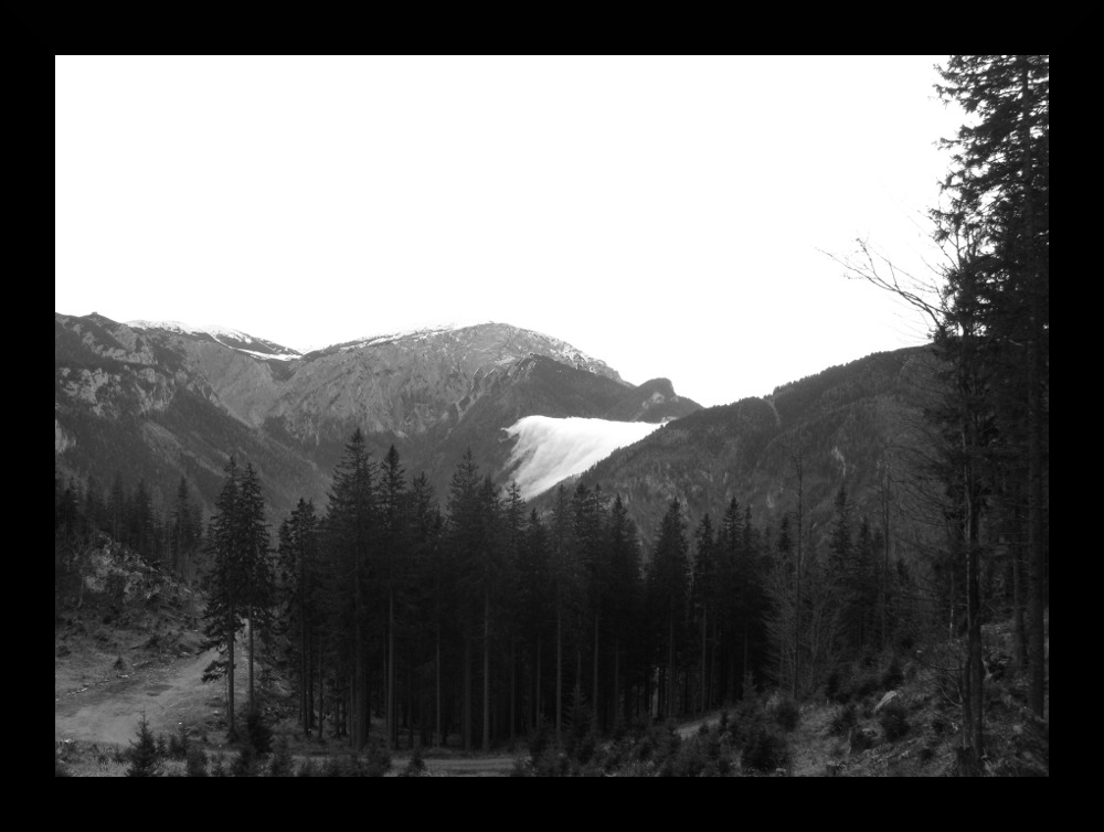 Nach einer längeren Durststrecke mit ohne Touren hatten sich Wolfgang und ich den Samstag vorgenommen, um auf den Großen Sonnleitstein, ein Felsgipfel inmitten der Wiener Hausberge, zu gehen. Es bot sich auch an, da südseitig kaum Schnee lag, man auf jeden Fall über der Nebelgrenze sein würde, die Fernsicht ausgezeichnet vorhergesagt war und dazu noch leichte Plusgrade und kaum Wind. Wir starteten vom Parkplatz in Hinternaßwald bei kühlen +4 Grad (laut Autothermometer) und unangenehmen Talauswind. Exakt am Parkplatz vereinen sich die Täler des Wasseralmbachs (Westen) und Reißbachs (Süden). Nur wenige Schritte Richtung Westen war durch die Reißtalklamm hindurch ein Anblick geboten, der uns während der Wanderung begleiten sollte, und mein Meteorologenherz höher schlagen ließ: