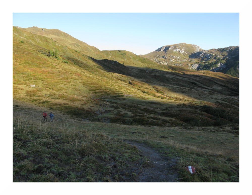 Vor mir der Abstiegsweg links an der felsigen Erhebung vorbei und dann rechts hinab zur Kleinarler Hütte.